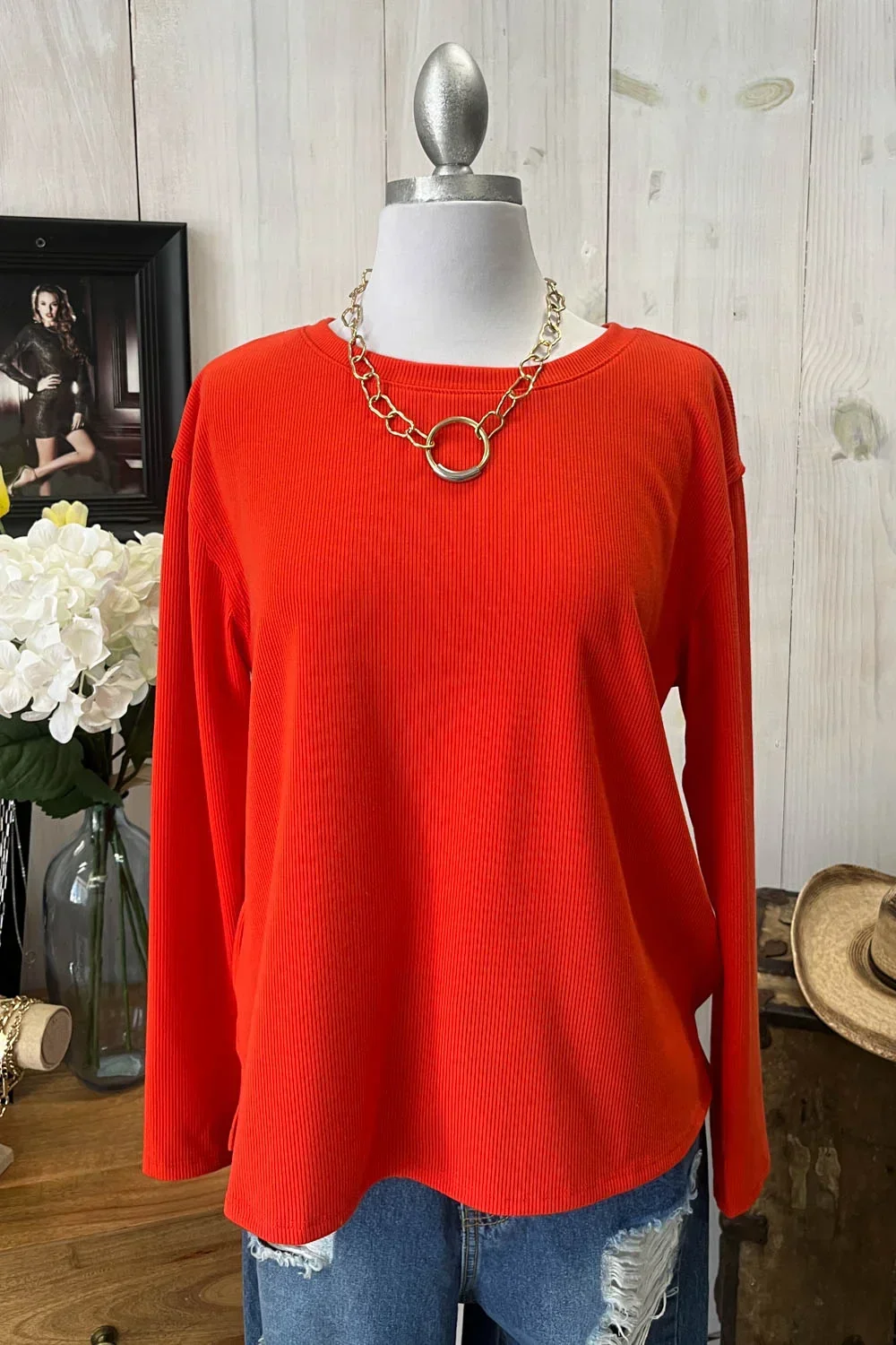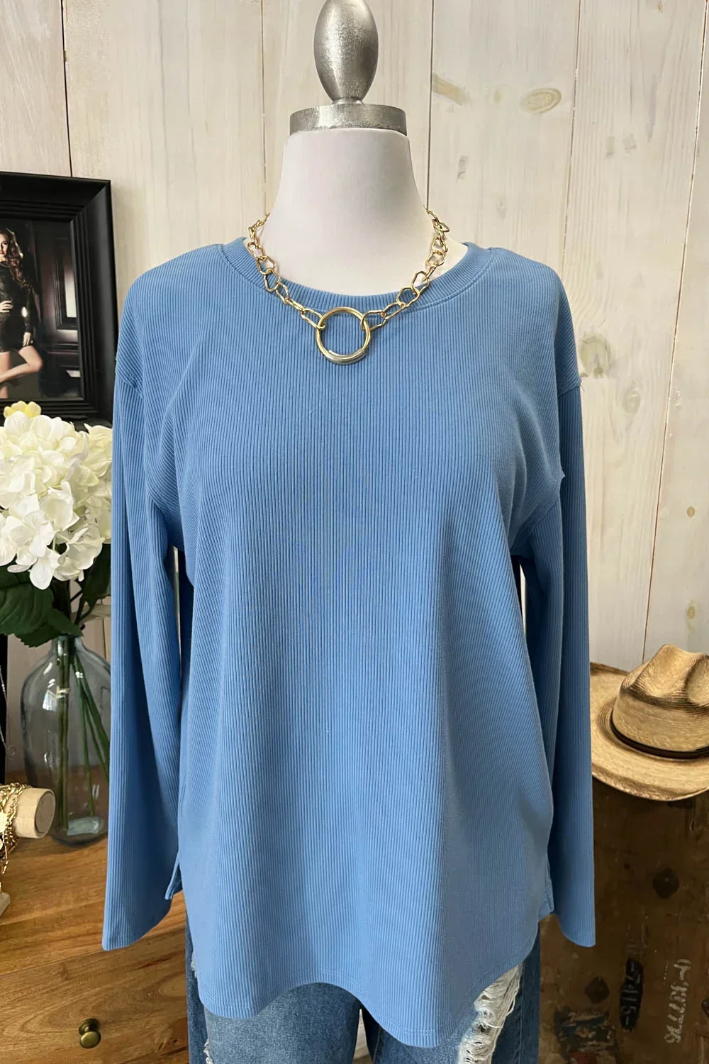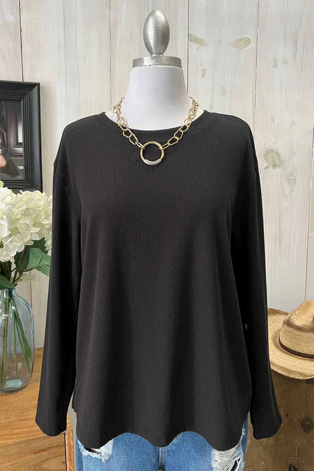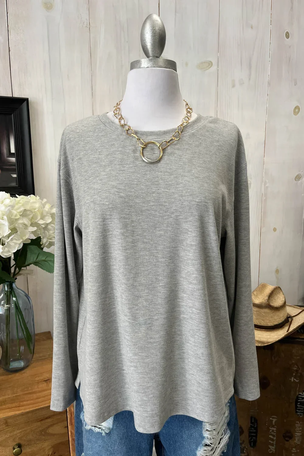 Soft Ribbed Knit Long Sleeve Scalloped Hem Relaxed Fit Oversize Boutique Top