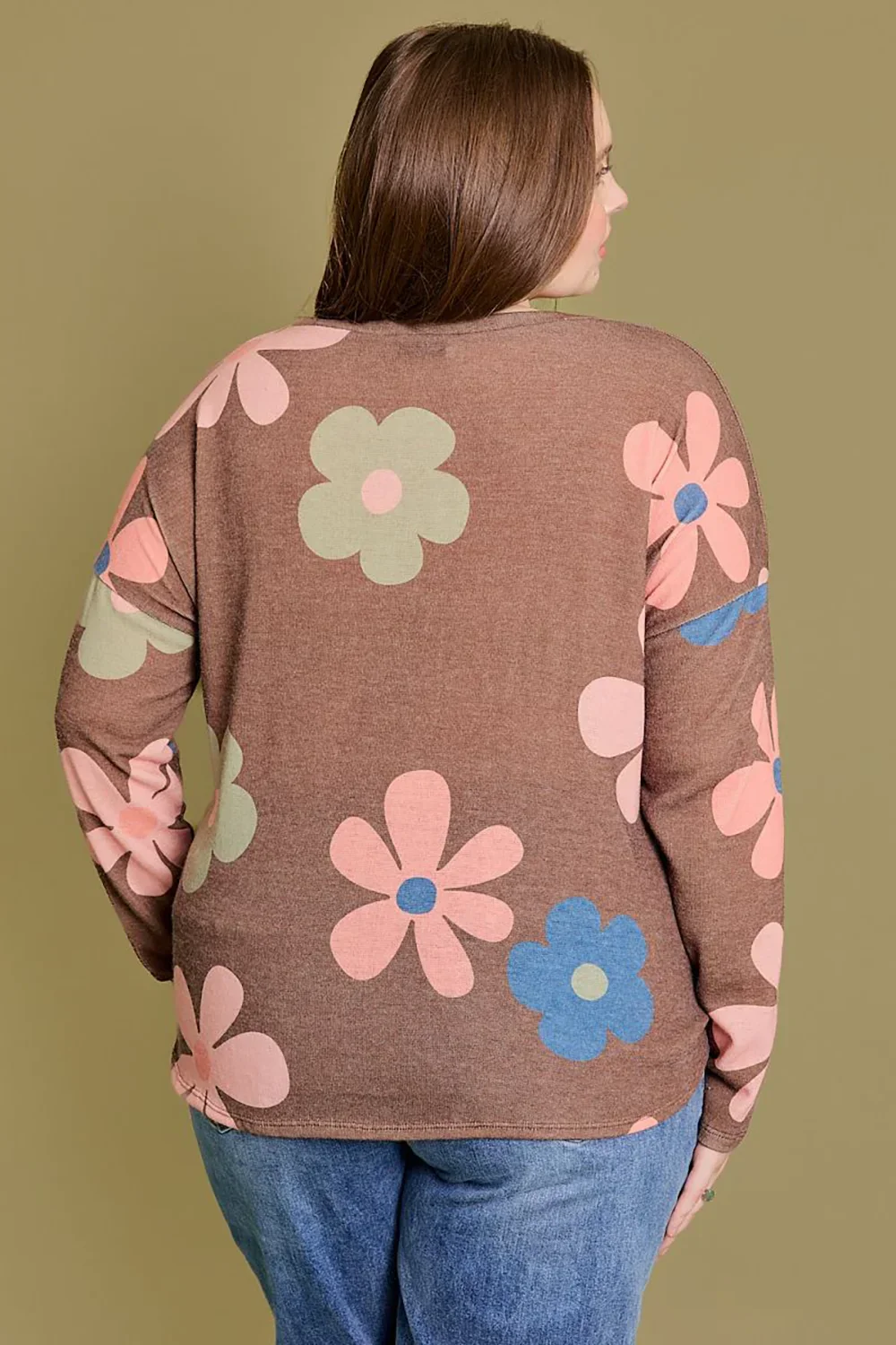 Plus Size Retro Floral Print Long Sleeve Twisted Hem Relaxed Fit Boutique Top