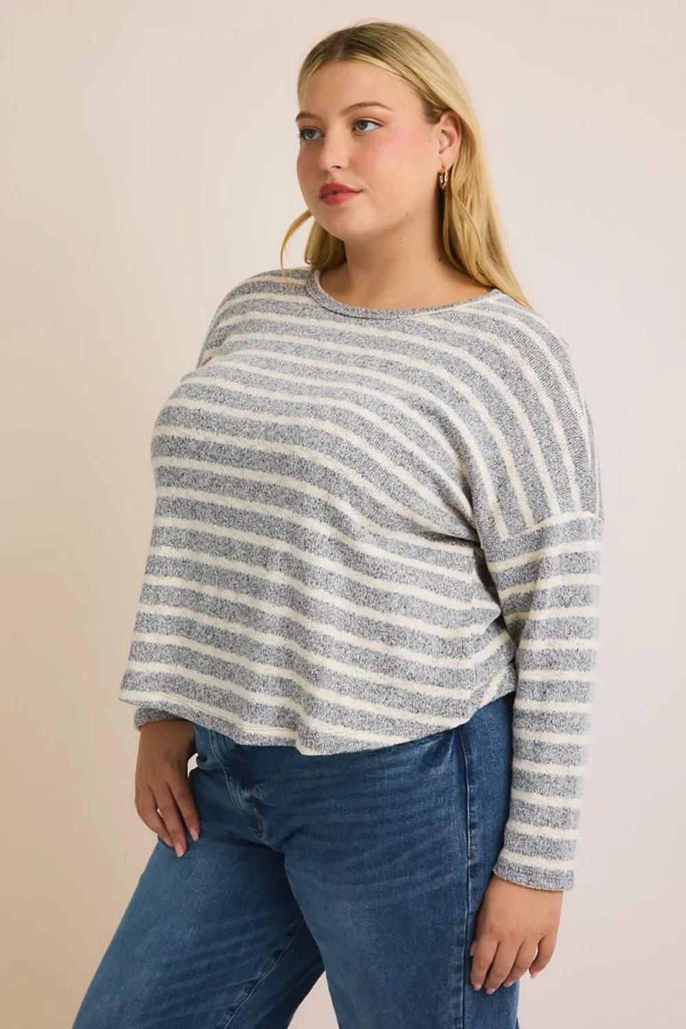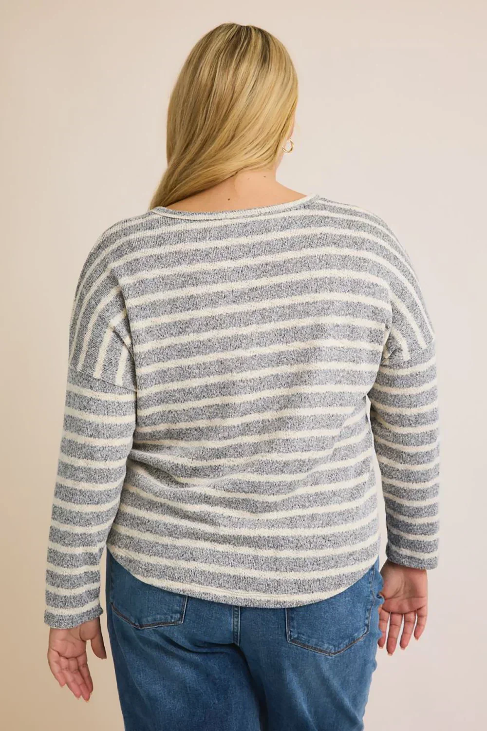 Plus Size Grey Cream Striped Long Sleeve Scalloped Hem Relaxed Fit Knit Top
