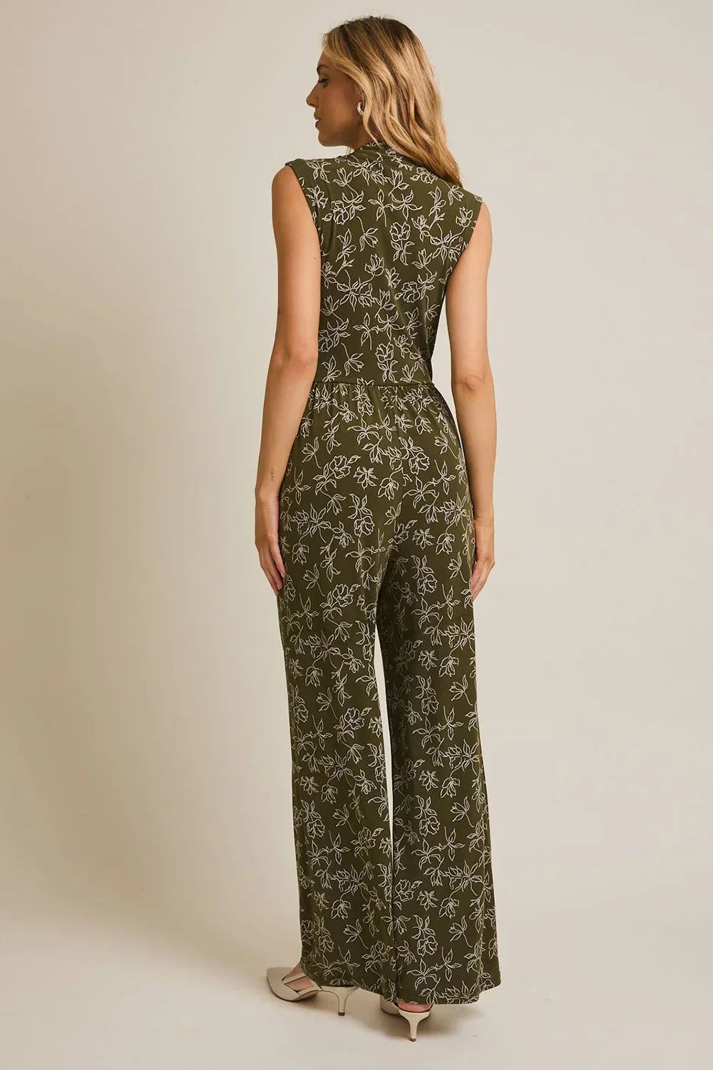 Olive Green Floral Print Front Wrap Sleeveless Wide Leg Boutique Jumpsuit