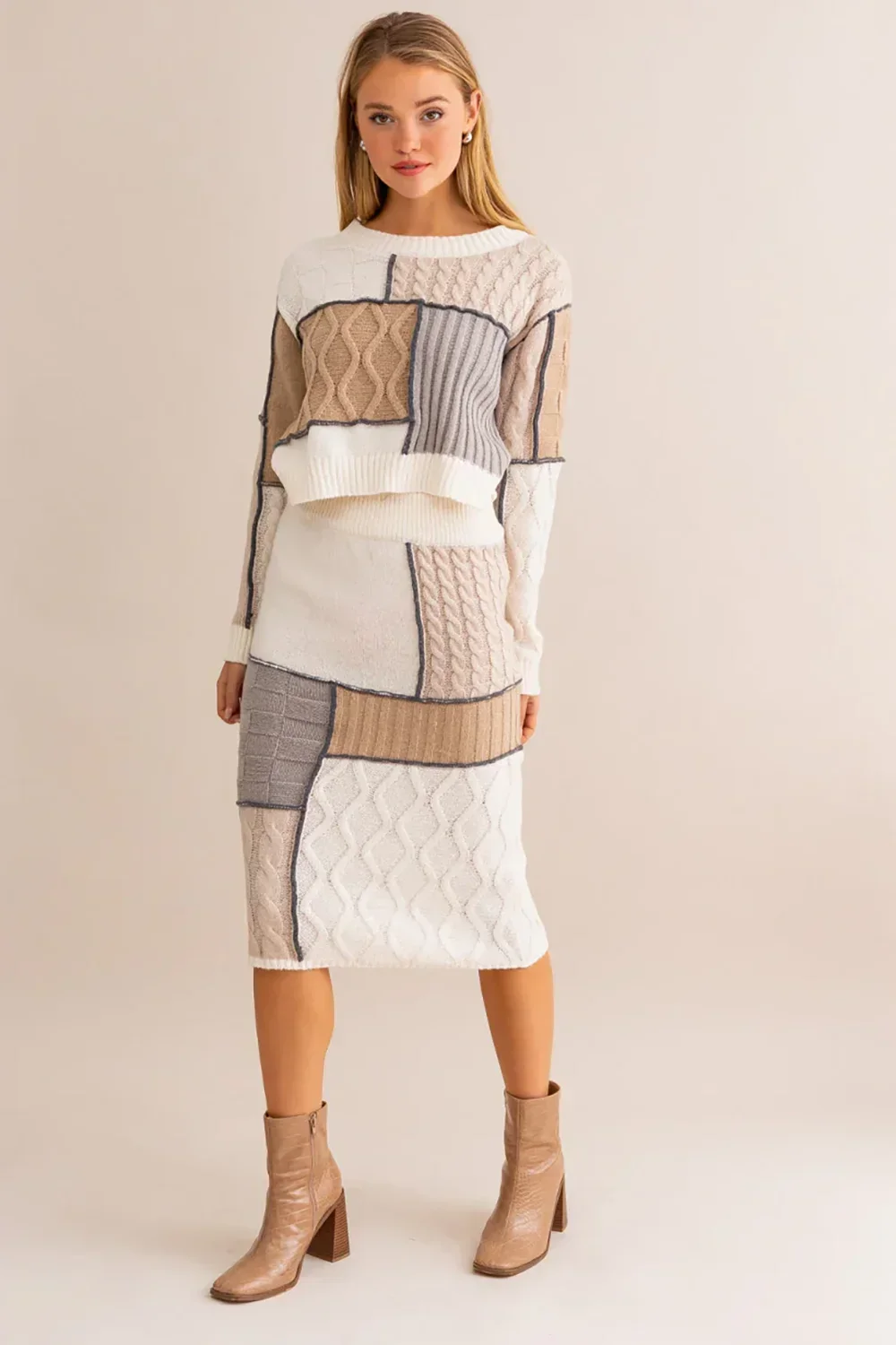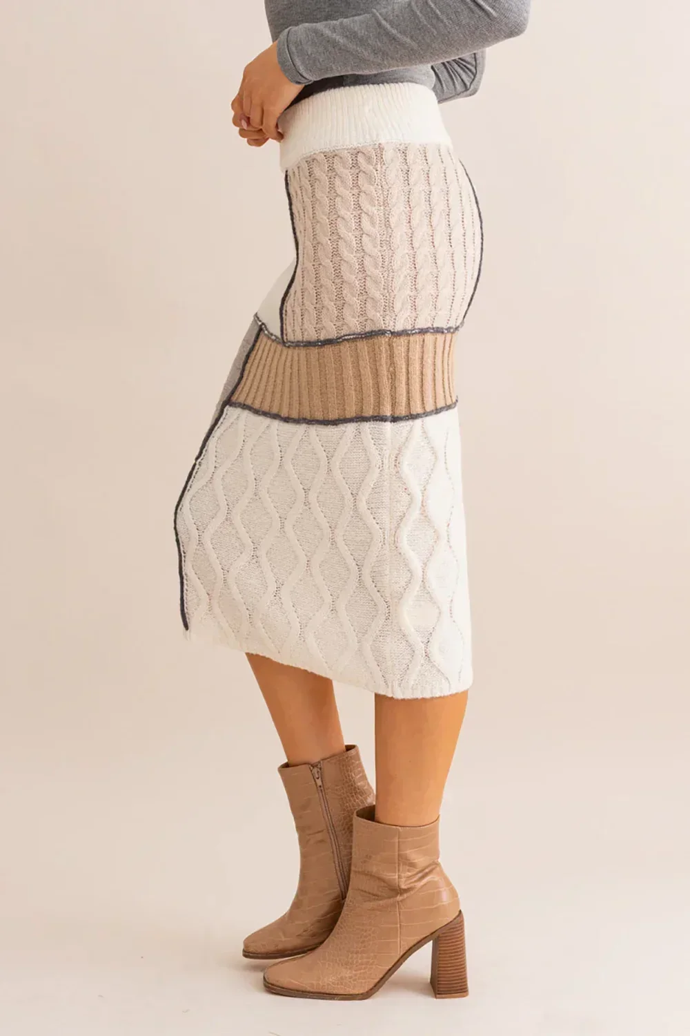 Neutral Colorblock Ribbed Waistband Cable Knit Patchwork Midi Pencil Skirt
