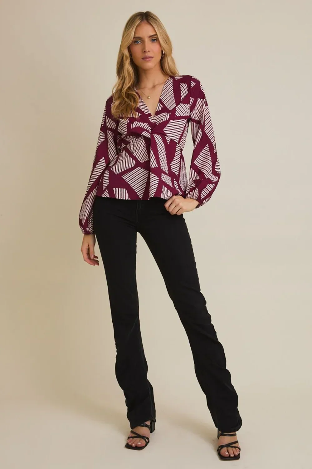 Plus Size Geometric Print Long Sleeve Surplice Peplum Top