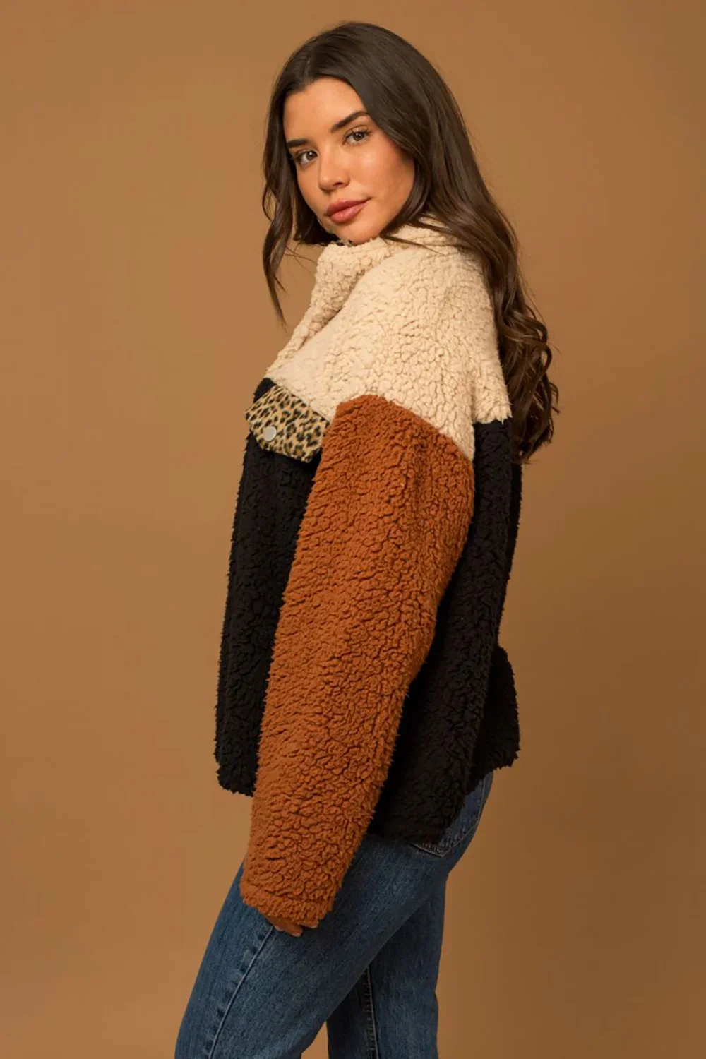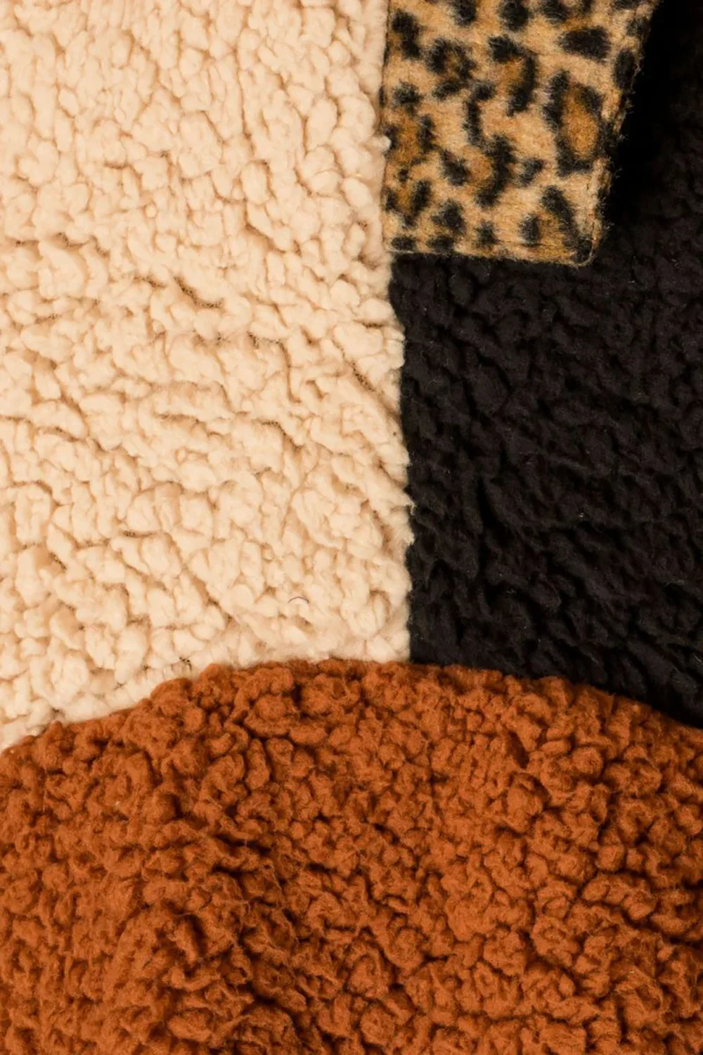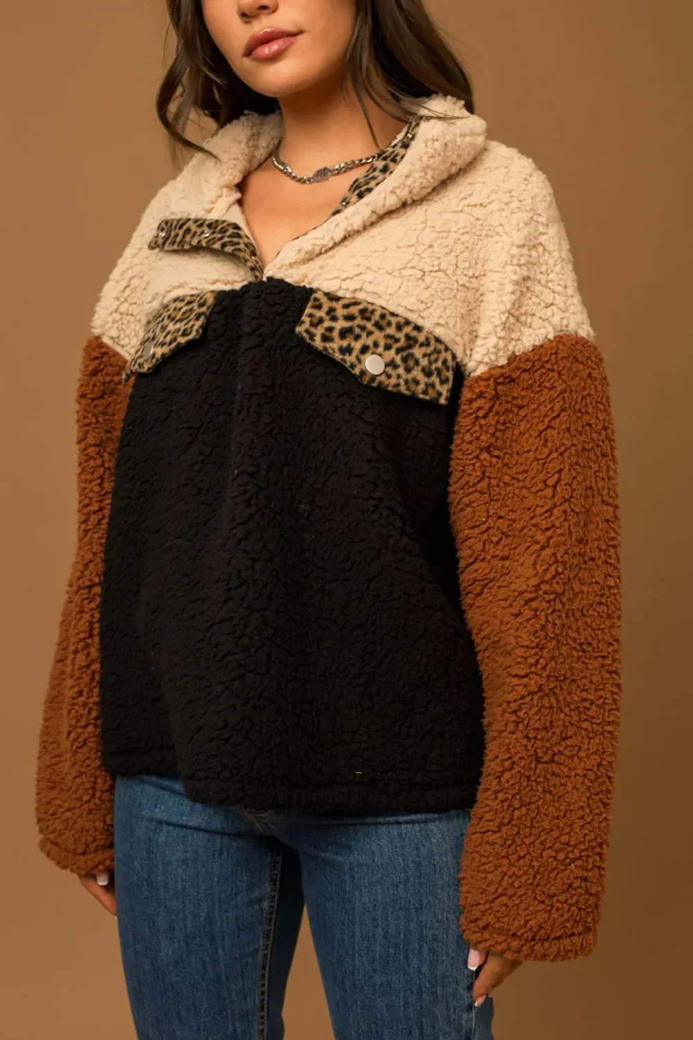 Colorblock Leopard Print Trim Sherpa Fleece Pullover Sweater