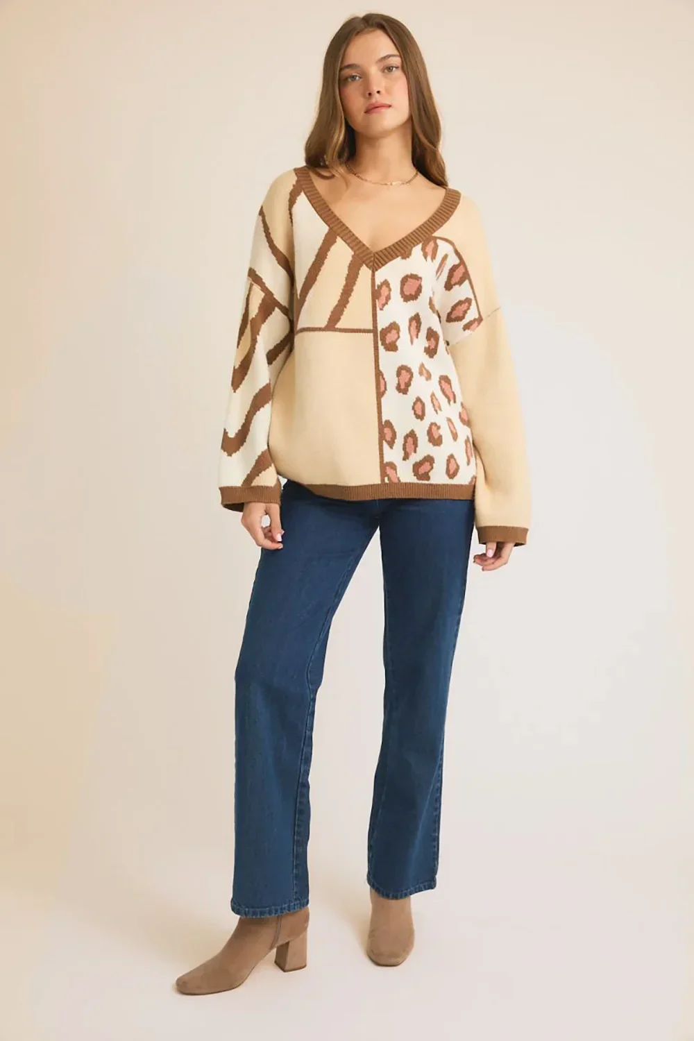 Oversize Cream Leopard and Zebra Patterns Colorblock V Neck Sweater